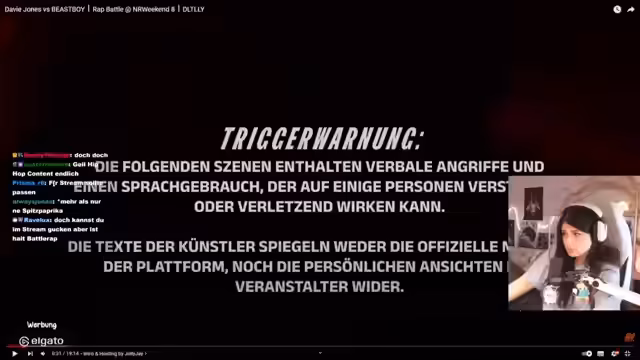 01:21:11Zu Beginn des Streams wird ein intensives Rap-Battle zwischen zwei Künstlern analysiert, das als hochkarätig und instant classic bezeichnet wird. Die Rezension fällt detailreich aus und hebt die unterschiedlichen Stile der Rapper hervor, während deren persönliche Konflikte und Beleidigungen aus den Texten thematisiert werden. Der Kommentator erkennt den Sieg des Teilnehmers Taddle an und würdigt die Leistung beider Künstler, insbesondere die Konstanz von Davy Jones bei seinem 50. Battle.