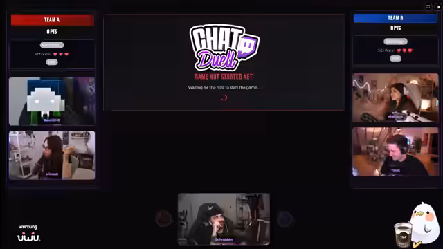 02:19:39Die Streamer ankündigen, dass in Kürze ein Quiz stattfinden wird, das von Robin vorbereitet wurde. Die teilnehmenden Teams und Personen stehen fest: BastiGHG, Kevin, Kroko, Tamina und Timmit bilden ein Team, während Robin, Mala und Mina das andere Team bilden. Kurz vor dem Quiz werden noch technische Probleme bei der Anzeige der Webcams im Overlay gelöst, um eine reibungslose Durchführung zu ermöglichen. Nach der Behebung der technischen Schwierigkeiten kann das Quiz beginnen.