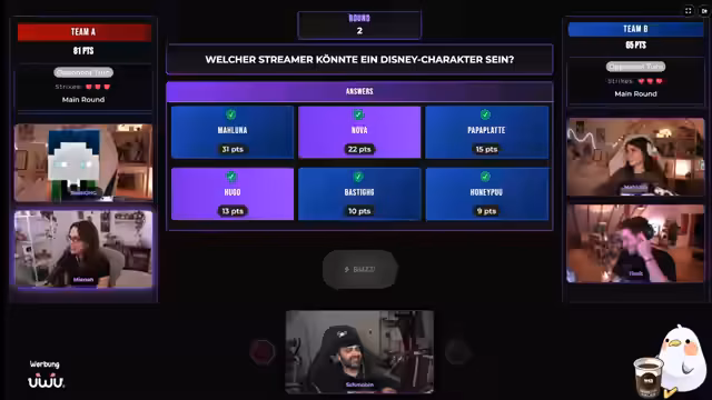 04:26:51Die Quizrunde konzentrierte sich auf die Frage, welcher deutsche Streamer einem Disney-Charakter ähnlich sehen könnte. Die Teilnehmer schlugen Namen wie Maluna, Robin, Papaplatte, Monte, Sabex, Tamina, Niek und Kroko vor. Es wurde intensiv über die Erkennbarkeit durch Chat-Antworten diskutiert. Platz 1 in dieser Kategorie ging überraschend zu einem Charakter aus der Serie 'Disneys große Pause'.