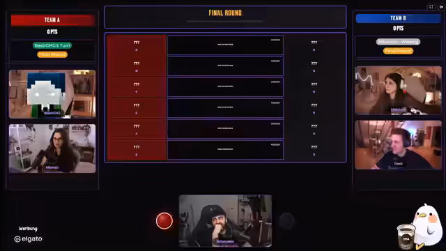 04:52:25In der finalen Runde ging es darum, welcher Streamer am ehesten einen Marathon schaffen würde. Platz 1 ging mit 45 Prozent an einen Streamer, von dem man vermutete, dass er durchzieht und grinded. Weitere Calls warenTrimax auf Platz 5, Sydney auf Platz 4 und Willi auf Platz 6. Als Joke-Antwort wurde auch der Streamer Basti selbst genannt, der auf Platz 2 landete. Nach der Runde wurden die Endpunkte von beiden Teams bekannt gegeben.