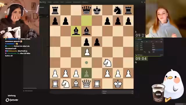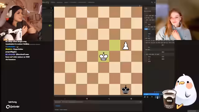 00:21:41Nach einem kurzen telefonischen Austausch mit Sonja beginnt der gemeinsame Stream. Die technische Einbindung in den Discord-Chat gestaltet sich etwas holprig. Der Streamer wechselt in sein OBS-Setup, um eine bessere Qualität zu gewährleisten. Anschließend beginnen sie mit dem geplanten Schach-Training. Der Fokus liegt auf elementaren Bauernendspielen, insbesondere auf der strategischen Bedeutung der 'Opposition' – einer Position, in der sich die Könige gegenüberstehen und ein Feld dazwischen ist.