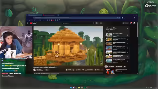01:32:03Der Streamer beginnt mit dem Bau eines Baumhauses, das zwei Häuser beherbergen soll. Dabei beschreibt er, dass er anfangs ein Tutorialvideo als Vorlage nutzt, aber schnell zum freien Bauen übergeht. Das Projekt ist Teil der Feeninsel, die als Fairy-Tal bezeichnet wird. Er experimentiert mit verschiedenen Baumaterialien wie Fichte und Dark Oak und überlegt, wie er die Struktur am besten gestalten kann.