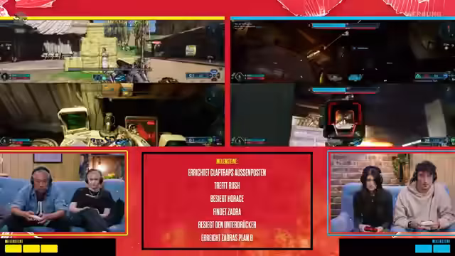 00:14:15Die erste Challenge des Abends ist ein Speedrun durch die Story-Mission, beginnend nach dem Prolog. Es gibt mehrere Meilensteine, die erreicht werden müssen, darunter das Erreichen von Claptraps Außenposten, das Treffen von Rush, das Besiegen von Horace, das Finden von Zedra, das Besiegen des Unterdrückers und das Erreichen von Zedras Plan B. Für jeden erreichten Meilenstein gibt es Punkte, wobei das Team mit den meisten erreichten Meilensteinen am Ende fünf Punkte erhält. Zusätzlich gibt es Bonuspunkte für jedes erreichte Level, wobei jeder Spieler pro Level-Up einen Punkt zum Teamkonto beiträgt. Es gibt auch Minuspunkte für das Überspringen von Cutscenes. Die Streamer einigen sich darauf, keine Cutscenes zu überspringen, um Minuspunkte zu vermeiden.