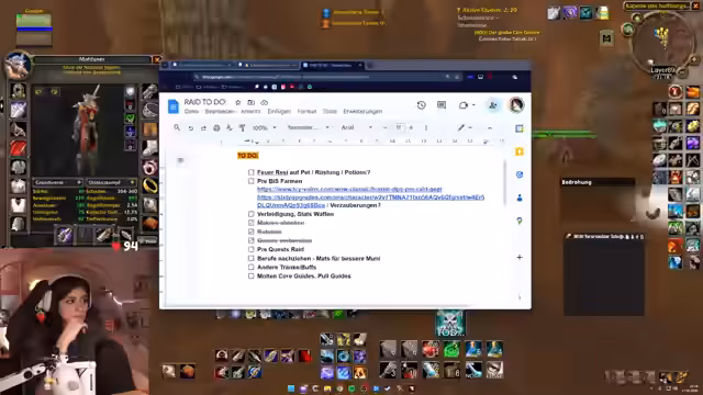 01:40:38Die Planung für einen zukünftigen Raid im Geschmolzenen Kern beginnt. Die Streamerin erklärt die Notwendigkeit, die Prequest abzuschließen, um Zugang zum Raid zu erhalten. Sie geht auf die Mechaniken des ersten Raumes ein, in dem sich alle eng an den Fackelträger halten müssen und Fallen im Raum streng verboten sind.