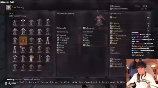 04:22:24Um seine Chancen zu verbessern, unternimmt der Streamer taktische Anpassungen. Er wechselt die Waffe, um mehr Schaden zu erzielen, und optimiert seine Rüstung für höhere Feuerresistenz, was ihn jedoch in puncto Mobilität ('Lightroll') anfälliger macht. Auch die Positionierung wird analysiert; er muss nah am Boss bleiben, um den Lasern aus dem Weg zu gehen, und gleichzeitig versuchen, unter ihm ausweichen zu können, um dem Feuerkotzen zu entgehen. Dennoch enden die meisten Versuche im Tod.