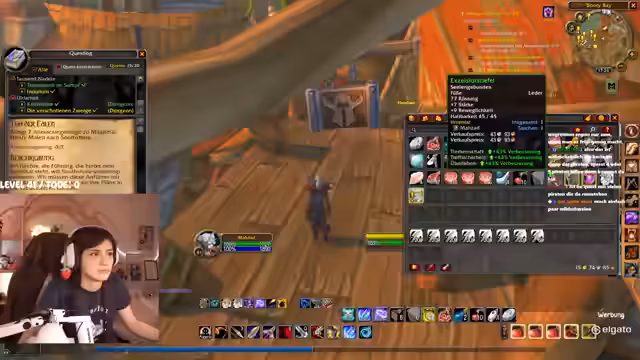 08:03:24Die Streamerin konzentriert sich darauf, den wichtigen Booty-Bay-Flugpunkt zu erreichen, indem sie eine Questreihe in der Nähe von Westfall absolviert. Da sie selbst noch nie die Route geschwommen ist, zeigt sie sich unsicher und bittet den Chat um Anleitung. Gemeinsam mit einem Chat-Teilnehmer bricht sie auf, um die gefährliche Küste zu umschwimmen und die Questobjekte, wie das 'Auge des Nefarian' und 'Schnupftabak', für die anschließenden Piraten-Quests zu sammeln.