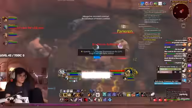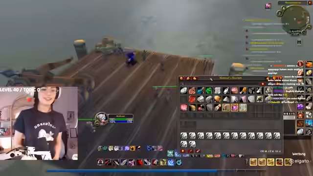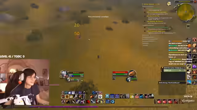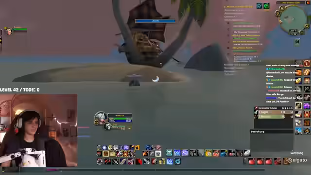 08:23:30Nachdem sie den Flugpunkt erreicht hat, beginnt die Streamerin mit den Piraten-Quests in Booty Bay. Sie wird von Chat-Teilnehmern unterstützt, wobei die Lage auf den Schiffen als besonders heikel angesehen wird, da die Monster schnell respawnen und man leicht eingekesselt werden kann. Trotzdem starten sie einen Kampf auf einem der Schiffe, der zu einem gefährlichen Encounter wird. Es kommt zu einem Massenpull und plötzlichem Disconnect eines Gruppenmitglieds, was die Situation für die Streamerin und ihren Begleiter extrem angespannt gestaltet.