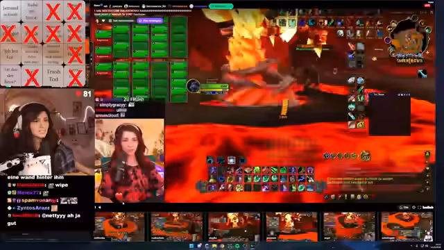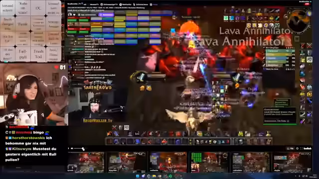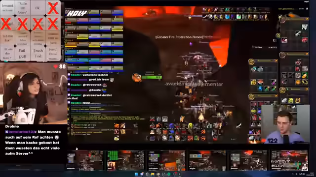 04:44:43Der Stream beginnt mit dem finalen Bosskampf im Molten Core. Die Raider müssen sich vor Lava und Feuer schützen, während einige Spieler in die Lava fallen. Es kommt zu mehreren kurzen, unangekündigten Pausen. Die Stimmung ist entspannt, aber die Aufmerksamkeit der Spieler ist während des intensiven Kampfes gefordert. Die Kommunikation unter den Teilnehmern bleibt dabei klar und zielorientiert.