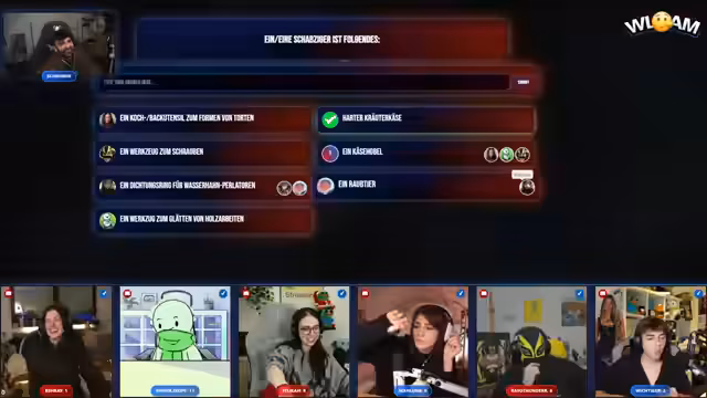 02:56:27Ein neues Ratespiel konzentriert sich auf ungewöhnliche Begriffe. Die erste Frage, 'Was ist ein Perlatore?', beschäftigt die Teilnehmer, da niemand die Antwort zu kennen scheint. Der Chat diskutiert verschiedene, oft humorvolle Deutungen. Die richtige Antwort ist laut Streamer 'Käsehobel'. Die zweite Frage, 'Was ist eine Schabzieger?', wird ebenfalls kontrovers diskutiert. Die Runde endet mit der Erklärung, dass ein 'harter Kräuterkäse' gemeint war, was viele als ungewöhnlich empfinden.