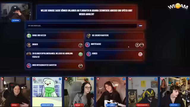 03:05:17Bei der Frage, was Urlauber am Flughafen Arianda in Schweden abgeben und wieder abholen können, werden im Chat von Drogen über Winterjacken bis hin zu Kindern skurrile Vorschläge gemacht. Der Streamer gibt als richtige Antwort 'Sauerteig' bekannt und erklärt den Konzept des 'Sauerteig-Hotels', bei dem man seinen Teig wie einen Hotelgast in Obhut geben lässt, damit er während des Urlaubs von Profibäckern gepflegt wird und beim Abholung frisch ist.