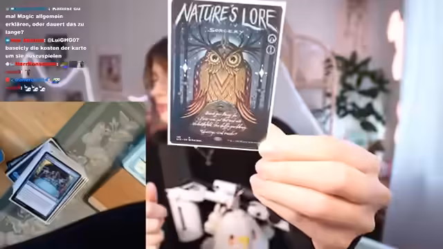 00:27:20Um auf den bevorstehenden Besuch vorzubereiten, zeigt die Streamerin ein speziell für sie zusammengestelltes Magic: The Gathering Deck. Das Konzept ist ein 'Eulen-Only-Deck', angelehnt an einen Charakter namens Euli aus ihrer World of Warcraft Zeit. Sie erklärt die Funktionsweise ihres Commanders, der 'Evi, himmlische Taktikerin', und präsentiert zahlreiche Karten mit Eulen-Motiv. Besonders hervorgehoben werden handgefertigte, gedruckte Karten und Spielsteine, die Lukas für sie angefertigt hat, sowie ein Detailfehler auf einer Karte, der sich erst beim Händehalten offenbarte.