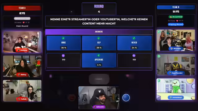 02:00:08Die vierte Runde thematisiert Streamer oder YouTuber, die keinen Content mehr produzieren. Nach anfänglichem Stutzen und Nennen von Namen wie 'German Let's Play' oder 'Dagi Bee' kristallisieren sich bei den Teams die Kandidaten 'Phil Laude', 'Stegi' und 'Simon Desue' heraus. Die Teams diskutieren intensiv, wer zutrifft und wer lediglich eine Pause eingelegt hat. Letztendlich wird 'Stegi' als korrekte Antwort auf Platz 4 identifiziert, was die Teams als sehr gute und überraschende Call werten.