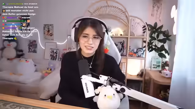 00:22:38Die Streamerin führt eine humorvolle Rolle als Therapeutin und simuliert eine Arztkonsultation. Dies führt zu einem ernsteren Thema: ihren Erfahrungen mit zu viel Koffeinkonsum. Sie berichtet, dass sie während ihrer langen Streams bei WoW täglich mehrere Kannen Schwarztee, Energydrinks und Kaffee getrunken habe, was zu einem sehr hohen Puls führte. Inzwischen hat sie sich das Koffein weitgehend verboten, erlaubt sich aber gelegentlich eine Tasse Tee und einen Kaffee.