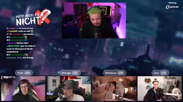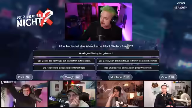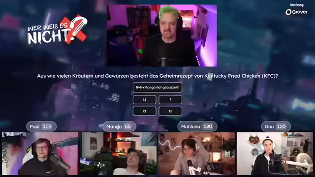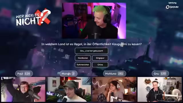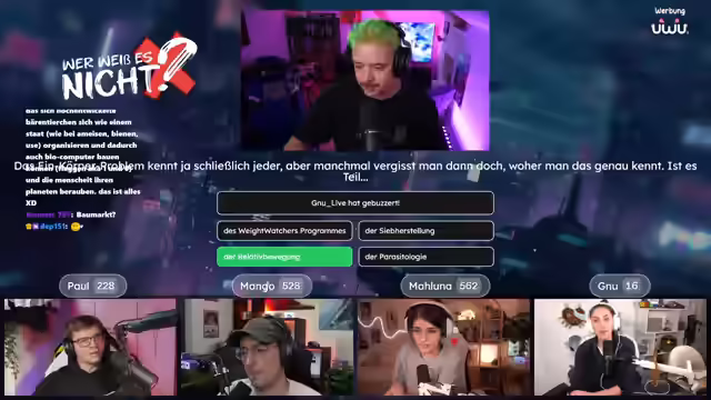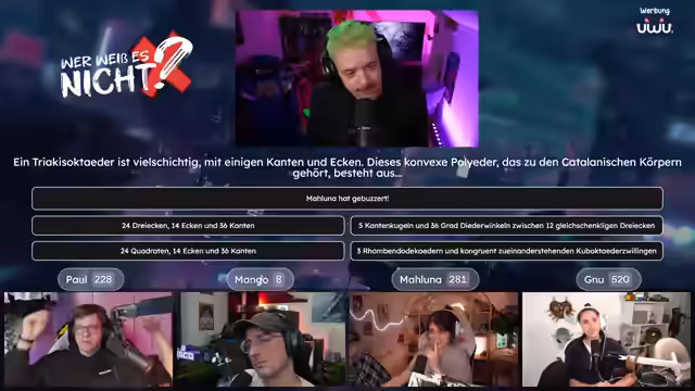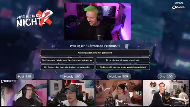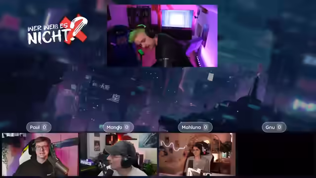 04:02:36Es wird die Quizshow "Wer weiß es nicht" angekündigt, bei der es darum geht, wer etwas nicht weiß. Die Teilnehmer Paul, Mango und Maluna werden begrüßt. Es gibt technische Probleme mit der Anzeige der Antwortmöglichkeiten, die jedoch schnell behoben werden können. Die erste Frage lautet: Welches Tier hat das härteste biologische Material? Mango buzzert und setzt 99 Punkte auf Paul. Paul leitet die richtige Antwort (Napfschnecke) her und gewinnt. Es wird erklärt, dass die Napfschnecke ihre Zähne zum Abschaben von Algen von Felsen verwendet. Es wird betont, dass man nie ganz aus dem Spiel ist. Es wird diskutiert, ob man mit dem Buzzern warten soll, bis die Frage und die Antwortmöglichkeiten vollständig vorgelesen wurden. Die nächste Frage lautet: Was ist ein Barmezid-Festmahl? Paul buzzert und setzt 10 Punkte auf Muzzert. Muzzert antwortet falsch, wodurch Paul 20 Punkte gewinnt. Es wird erklärt, dass ein Barmezid-Festmahl ein imaginäres Festmahl ist. Die nächste Frage lautet: Woraus wurde der Oscarpreis während des Zweiten Weltkriegs hergestellt? Mango buzzert und setzt 15 Punkte auf Gnu. Gnu antwortet richtig (Gips) und gewinnt 15 Punkte. Es wird erklärt, dass die Gips-Oscars nach dem Krieg gegen Goldstatuen eingetauscht werden durften. Die nächste Frage lautet: Was ist die Glabella? Paul buzzert und setzt 15 Punkte auf Mango. Mango antwortet falsch, wodurch Paul 30 Punkte gewinnt. Es wird erklärt, dass die Glabella der Bereich zwischen den Augenbrauen ist. Die nächste Frage lautet: Was ist das Nationaltier von Schottland? Paul und Maluna setzen jeweils 5 Punkte auf Paul (Einhorn). Paul antwortet richtig und gewinnt. Es wird erklärt, dass das Einhorn seit dem 15. Jahrhundert das offizielle Nationaltier Schottlands ist. Die nächste Frage lautet: Was ist Crapulence? Genug buzzert.