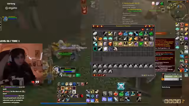 00:58:03Nach der technischen Problemlösung wird der Dungeon-Raid fortgesetzt. Der Streamer fährt fort, seine Aufgaben zu erledigen, nachdem er mit dem Chat über die vorherige Situation gesprochen hat. Er sammelt nun Questgegenstände in dem Dungeon und berichtet, dass sie wahrscheinlich relativ spät die Level-60-Reiche erreichen werden. Das Thema wird angestoßen, dass bestimmte, seltene Gegenstände nur schwer zu bekommen sind, was auf den langen Grindeinsatz hindeutet.