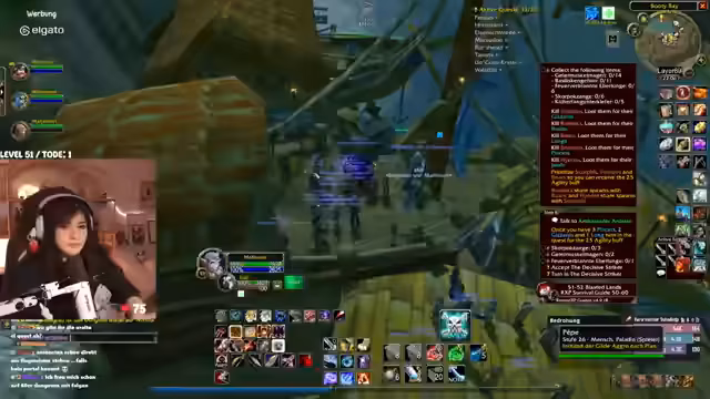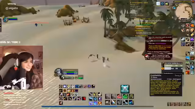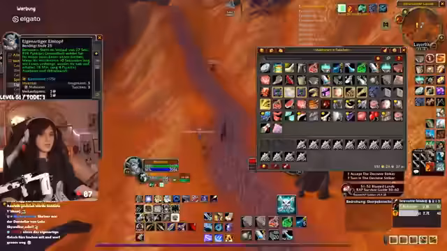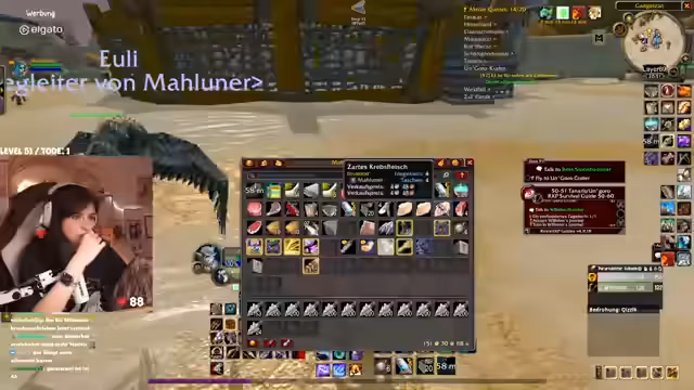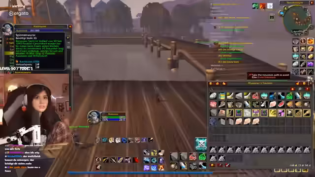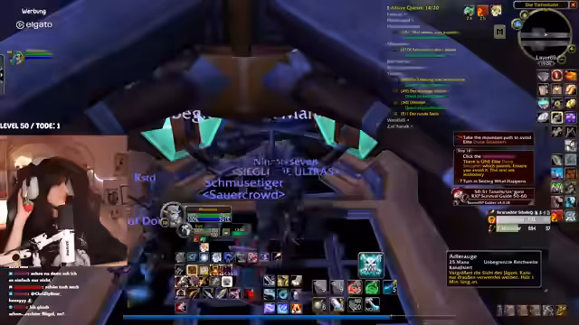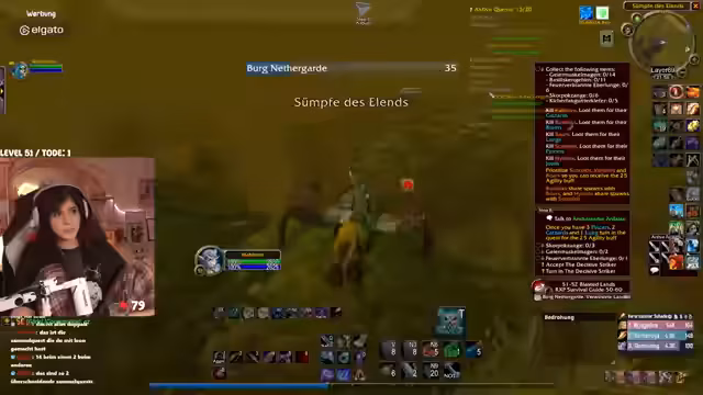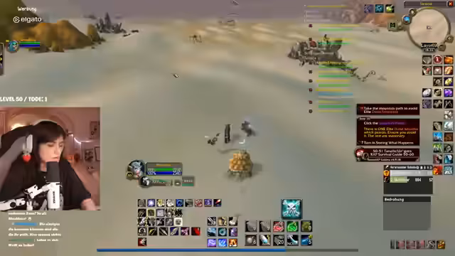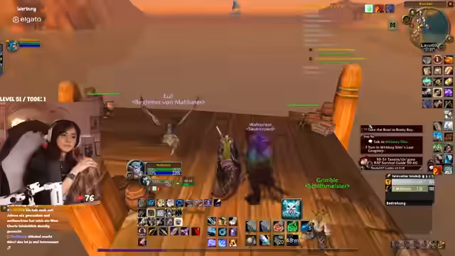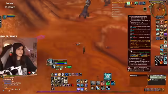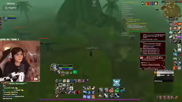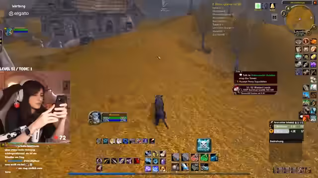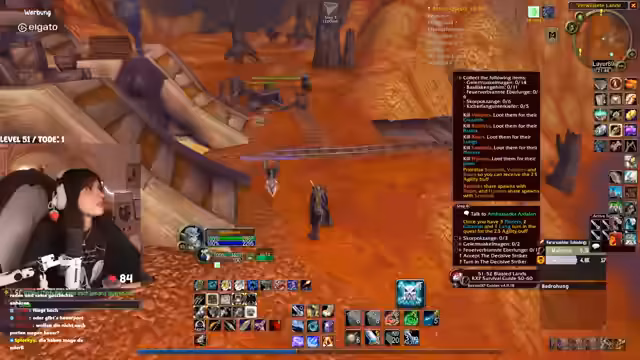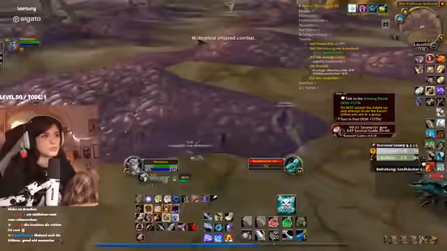 00:31:27Der Stream wird von technischen Problemen überschattet. Die Streamerin bemerkt eine extrem hohe Latenz im Discord von mehreren Sekunden, was die Kommunikation erschwert. Nach einem Wechsel des Spielgebietes stabilisiert sich die Situation wieder. In Bezug auf das Gameplay geht es um die Quest "Erlösung von Skims Hank" im Gebiet Tanaris. Die Streamerin und ihr Partner müssen vorsichtig Elite-Mobs umgehen, während sie eine Escort-Quest für ein Huhn durchführen, das in gefährliches Terrain läuft, in dem sie von mehreren Gegnerwellen attackiert werden. Der Chat hilft bei der Orientierung und Planung.