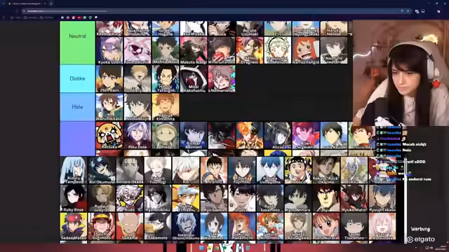 In einem mehrere Stunden dauernden Event wurde gemeinsam mit den Mods eine umfassende Anime-Tierliste erstellt. Dabei wurden Charaktere wie Monkey D. Ruffy und Eren Yeager intensiv diskutiert und eingestuft. Die Meinungen zur Einstufung der Charaktere waren dabei teilweise sehr geteilt und es entstand eine provisorische Top 10 Liste.