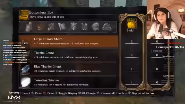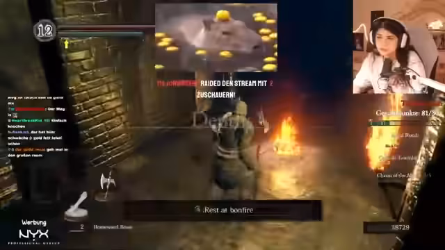 02:10:31Die Streamerin spielt jetzt Dark Souls und stellt ihren Run fort. Sie sammelt Seelen und bewegt sich durch das Spiel, wobei sie über ihre Taktiken und Schwierigkeiten spricht. Dabei entscheidet sie sich für bestimmte Waffen wie die Hellebarde und macht sich bereit für den nächsten Bosskampf gegen den Capra Demon. Die Atmosphäre ist entspannt, aber es bleibt das Ziel, möglichst selten zu sterben und das Spiel erfolgreich zu meistern.