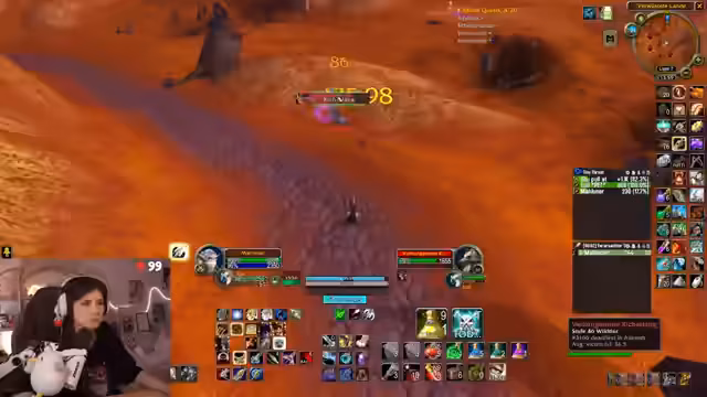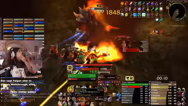 01:34:32Die Streamerin gibt Einblicke in die Vorbereitung für den Molten Core Raid. Sie zeigt einen Weak-Aura-Screenshot, der den exakten Sprungbereich in der Lava vor dem ersten Boss visualisiert. Es wird betont, dass Heiler Spieler, die in die Lava fallen, an den Rand laufen und weiterhin heilen können. Es werden Positionierungen am Lava-Fluss und die Anordnung der Hunter im Raid besprochen, insbesondere die Management-Aufgabe des einlullenden Schusses bei Lucifron.