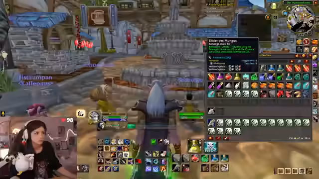 02:08:18Die Streamerin geht die letzte Inventarvorbereitung durch. Es wird betont, dass nur Essentials mitgenommen werden sollten. Thorium-Pfeile werden als essentiell angesehen und es wird empfohlen, den Köcher voll zu laden. Es gibt eine ausführliche Diskussion über mitzunehmende Tränke und Elixiere. Es wird erklärt, welche Tränke stacken und welche nicht, und warum Beweglichkeitselexire und Mongo-Elexiere sich gegenseitig aufheben. Der Fokus liegt auf Platzersparnis.