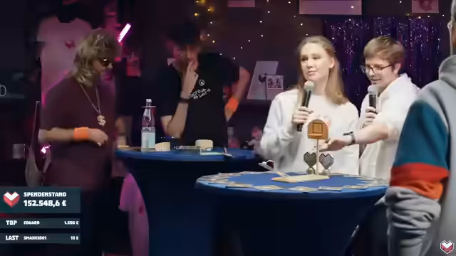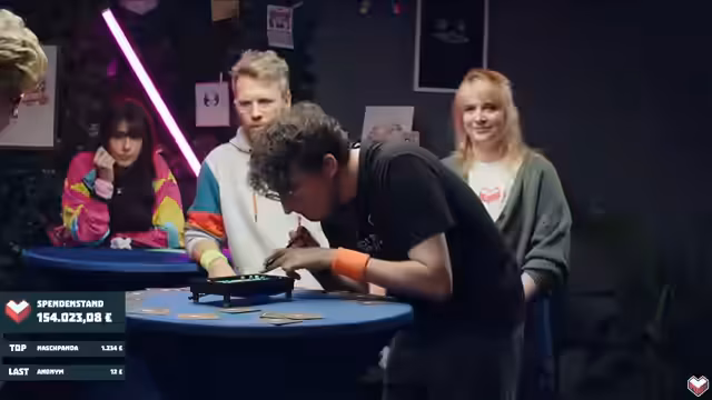 01:49:37Ein Dart-Turnier mit einem besonderen Spielkonzept beginnt. Die Teams werfen Pfeile, und die erzielten Punkte werden auf das Konto eines anderen gutgeschrieben. Das Team am Ende mit den wenigsten Punkten gewinnt. Während des Spiels wird der aktuelle Spielstand und die Spendensumme live angezeigt. In der Finalphase des Spiels steigt die Spendensumme auf über 177.000 Euro an, während Teams wie Pink, Orange, Grün und Gelb um den Sieg wetteifern.