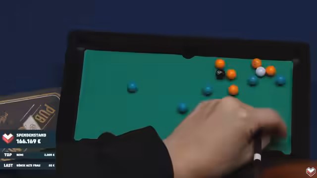 01:22:19Die Billard-Partie erreicht ihren Höhepunkt, als Maluna und Dirk in einem spannenden Duell gegen Mango antreten. Maluna gelingt es, die blauen Kugeln einzulochen, was für Begeisterung sorgt. Die Nervosität steigt, als der Tisch wackelt und die Zeit drängt, denn um 15 Uhr soll ein wichtiges Ziel erreicht werden. Der Chat feuert die Spieler enthusiastisch an, und es wird vorgeschlagen, als Ausgleich orangefarbene Kugeln einzulochen. Trotz kleinerer Missgeschicke und Diskussionen über die Positionierung der weißen Kugel bleibt die Spannung hoch. Maluna macht einen Punkt, und das Spiel läuft weiterhin auf Hochtouren, wobei die Möglichkeit eines Sieges durch das Einlochen der schwarzen Kugel besteht, aber bewusst für mehr Spannung gesorgt wird. Mango macht den dritten Punkt, und das Team feiert den Sieg, wobei der Pokal einen Ehrenplatz im Streamingregal erhalten soll.