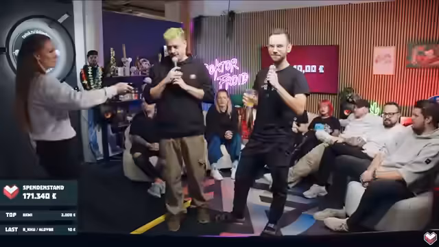 01:48:09Die Pubgames finden ihren Abschluss, und das Team, das zum dritten Mal abgeräumt hat, wird beglückwünscht. Insgesamt wurden sechs Pokale vergeben. Ein großer Dank geht an die Community für den Einsatz und die gesammelten 25.000 Euro während des Spiels. Es wird angekündigt, dass es direkt mit Darts weitergeht, um in PUBG-Stimmung zu kommen. Steven Schuto wird als Co-Host begrüßt, und die Gäste werden aufgefordert, die Mikrofone herumzureichen. Die Teams werden vorgestellt: Team Pink mit Paul, Maluna und Haschi; Team Grün mit Rick, Kapuzenwurm und Alea; Team Orange mit Snappy, Nils und Lillimon; und Team Gelb mit Gojke, Kimi und Kadi. Die Teams werden mit farbigen Bändern ausgestattet, und es wird auf die volle Couch und die wilde Atmosphäre hingewiesen.