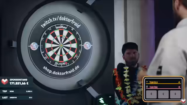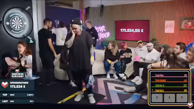 01:54:23Das Darts-Spiel beginnt mit einer besonderen Regel: Die erspielten Punkte gehen auf das Konto eines anderen Teams. Das Team mit den wenigsten Punkten am Ende gewinnt. Bevor ein Spieler wirft, muss er laut ansagen, auf wessen Konto die Punkte gehen sollen. Paul von Team Pink beginnt und wirft auf Team Gelb, erzielt 41 Punkte. Rick von Team Grün wirft auf Team Pink und erreicht 19 Punkte. Snappy von Team Orange wirft auf Team Grün und sammelt 21 Punkte. Die Dynamik im Raum wird schnell wild, da jedes Team versucht, die wenigsten Punkte zu haben. Das System registriert die Würfe, und die Spieler wechseln sich ab. Die Spendenstände werden weiterhin eingeblendet, und die Community wird zum Spenden aufgerufen, um die 200.000 Euro-Marke zu erreichen.