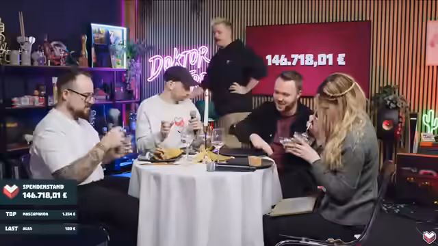 02:22:04Kurz vor 16 Uhr wird die Community erneut zum Spenden aufgerufen, um die 160.000 Euro zu erreichen. Pünktlich um 16 Uhr beginnt eine Spenden-Explosion, bei der zahlreiche 4- und 16-Euro-Spenden eingehen, was die Gesamtsumme schnell auf 174.000 und dann fast 175.000 Euro ansteigen lässt. Die Streamer sind begeistert und motivieren die Zuschauer, die 180.000 Euro zu knacken. Das Darts-Spiel wird fortgesetzt, während die Spenden weiterhin einströmen. Nils erzielt beeindruckende Würfe, darunter eine Triple 20 und ein Bullseye. Kimi von Team Gelb wirft auf Team Orange und erzielt eine Triple 20, was zu einer Diskussion über die Punktewertung führt. Die Regie klärt die Situation, und die Punkte werden korrekt addiert. Die dritte Runde der Darts-Partie beginnt, und die Teams kämpfen weiterhin um die wenigsten Punkte. Team Pink hat die meisten Punkte und verliert, während Team Grün mit den wenigsten Punkten gewinnt. Die 200.000 Euro-Marke soll bis 18 Uhr erreicht werden, während das nächste Programm, Gartic Phone, angekündigt wird. Es wird gewarnt, dass Gartic Phone wild werden kann und zweideutige Zeichnungen möglich sind. Die Streamer bereiten sich auf Gartic Phone vor und sammeln Ideen für Prompts, während die 180.000 Euro-Marke erreicht wird.