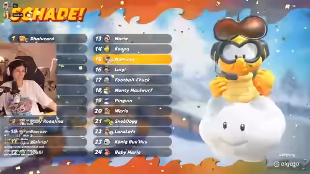 02:21:44Der Stream beginnt mit intensiven Mario Kart World Runden, die von zahlreichen Unfällen, frustrationsgeladenen Ausrufen und-itemgestützten Attacken geprägt sind. Die Spieler schießen sich mit Bomben, Blitzen und Bananen gegenseitig ab, was zu häufigen Platzierungen im hinteren Feld führt. Als Running Gag entwickelt sich eine Wette, bei der der letzte Platz in einer Runde zur Zahlung von Subs an andere Streamer oder die Community führen soll. Diese Wette nimmt eine zentrale Rolle im Geschehen ein und wird nach mehreren Runden mit einem "Crashout" absichtlich herbeigeführt. Der Fokus liegt auf der actionreichen, aber chaotischen Natur der Rennlobby.