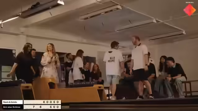03:52:51Dani wirft seine Kugel und erzielt die benötigte 7, was Team Reich zum Sieg führt. Das Spiel endet mit großem Applaus und Anerkennung für die dramatische Schlussphase. Danach folgt eine kurze Pause zur Erfrischung, bevor zur nächsten Spielrunde übergeleitet wird.