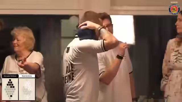 03:22:43Das Spiel beginnt mit Team Schlo, das eine Fünf warf. Ein Problem mit dem Anzeigesystem wird angesprochen, das technisch live fixiert wird. Ein neues Overlay-Programm wird entwickelt, das Zahlen und Unterstriche anzeigen kann. Die Teams positionieren ihre Zahlen gemäß der 'großen Hausnummer'-Regeln auf der Bohlebahn, die länger als andere Bahnen ist.