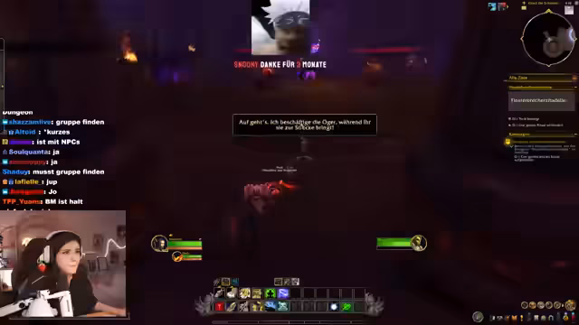 05:15:59Nach einiger Verwirrung bei der Questanahme wird der Dungeon-Finder aktiviert, um direkt den Dungeon "Mördergasse" zu starten. Ein zufälliges Team wird zusammengestellt. Die Streamerin agiert unerwartet als Tank und muss sich schnell in die Rolle und die Mechanics des Dungeons einarbeiten, während das Team durch die ersten Gegner kämpft.
