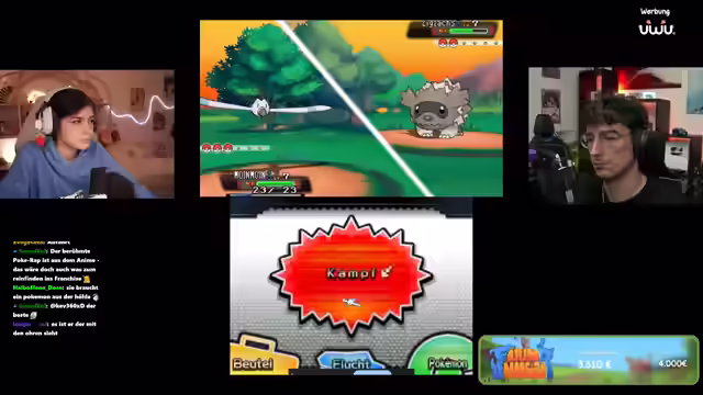 05:14:33Die Streamerin bereitet sich auf die erste Arena vor und heilt ihre Pokémon. Sie spricht über das Pokémon Celebi und ihre Erfahrungen mit der TCG-App. Es wird über die Arenaleiterin Felicia gesprochen, die eine Affäre mit dem Vater der Streamerin hatte. Die Streamerin erklärt, dass man in der Arena alle Trainer umgehen kann, wenn man will. Es wird über die Typen-Schwächen gesprochen und dass Gestein gegen Feuer schlecht ist. Die Streamerin versucht, den ersten Arenaleiter mit Glut zu besiegen, aber es ist nicht effektiv. Die Streamerin gibt Wingull auf die Eins im Team und besiegt ein paar wilde Pokémon. Die Streamerin erinnert sich an ein Anime-Quiz, bei dem es darum ging, so viele Pokémon-Namen wie möglich aus der ersten Generation zu nennen. Die Streamerin und ihr Teamkollege haben die Challenge gewonnen.