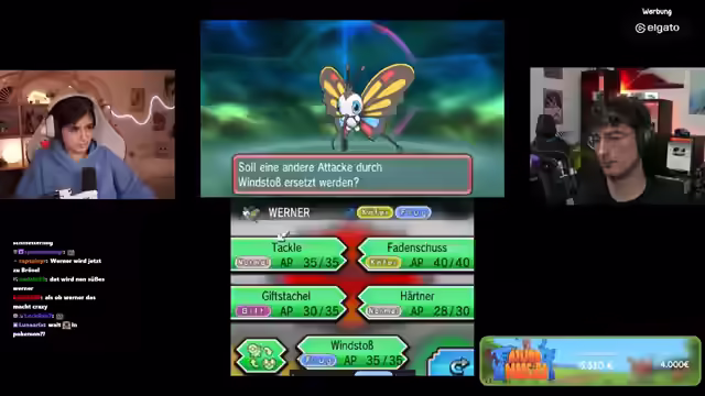 04:40:55Die Streamerin hilft beim Fangen eines Pokémon namens Trassler und erhält dafür ein Pokémon-Multi-Navi, das um die Funktion Spielnavi erweitert wurde. Mit dem Spielnavi können Pokémon gekrault und trainiert werden. Es wird über die nächste Stadt namens Meteoroth City gesprochen, in der die Arenaleiterin Felicia herausgefordert werden soll. Die Streamerin gibt Tipps zur Navigation auf der Karte und erklärt, dass man nach oben links muss, um in die nächste Stadt zu gelangen. Es wird über das Fangen von Wingull gesprochen, einem Pokémon, das selten in der Gegend vorkommt. Die Streamerin versucht, ein Shiny Wingull zu fangen, und erklärt die Wahrscheinlichkeit, dass ein Pokémon Shiny ist. Nach mehreren Versuchen gelingt es ihr, ein Wingull zu fangen, und sie überlegt, wie sie es nennen soll.