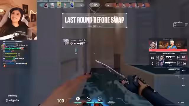 01:07:24Das Spiel neigt sich dem Ende zu, der Spielstand steht bei 9-11. Das Team startet eine Last-Runde-Analyse und gibt sich selbst Ratschläge für die Zukunft. Trotz einer kämpferischen Aufholjagd von 1,9 auf 16,18 KD kann das Spiel nicht mehr gedreht werden. Die Streamerin fühlt sich selbst für die Niederlage verantwortlich und analysiert die Fehler, besonders in entscheidenden Situationen wie fehlenden Waffenaustauschen.