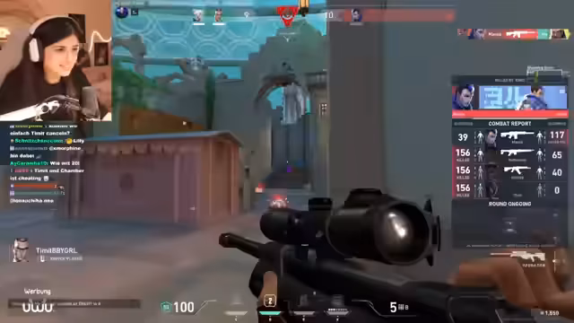 03:00:33Während des Streams kommt es zu wiederkehrenden Diskussionen über mutmaßliches Cheating im Spiel, insbesondere gegen eine gegnerische Reyna, als deren Spielweise als extrem verdächtig beschrieben wird. Die Streamerin äußert, dass ihrer Meinung nach die Reyna und auch andere Gegner wie Timmy und Reporter cheaten. Dies führt zu Frustration und der Feststellung, dass das Spiel unfair geworden ist. Ein Höhepunkt ist die Annahme, dass ein Spieler namens Mazat gebannt wird, wenn er cheatet.