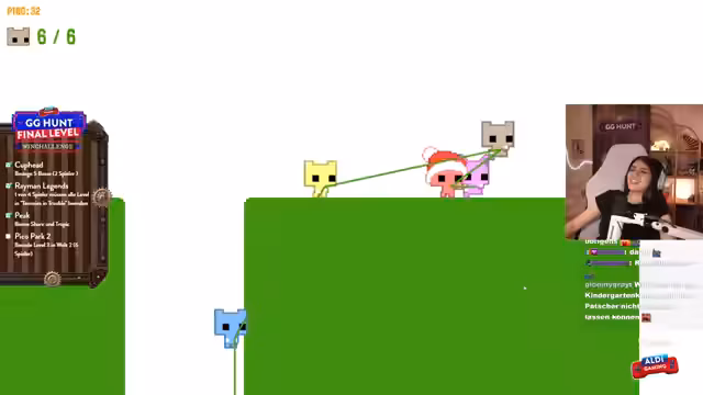 01:03:07Der Streamer verkündet, dass nun die Zeit für die Win-Challenge gekommen ist. Sechs Streamer - NoWay, Zeus, Nika, Lost Kitten, Stegi und Maluna - nehmen am finalen Level teil. Sie müssen vier verschiedene Spiele abschließen: Peak, Cuphead, Rayman Legends und Pico Park 2. Jedes abgeschlossene Spiel gibt ein Codefragment, das über das Jahr hinweg gesammelt wurde, um das finale 'Good Game für Alle' freizuschalten. Zusätzlich gibt es für Zuschauer Giveaways mit Preisen wie einem Aldi Reisengutschein oder einem Gaming-PC.