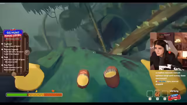 02:35:38Der Stream startet mit der WinChallenge bei Aldi Gaming TV. Die Teilnehmer versuchen, verschiedene Hindernisse zu überwinden und sammeln dabei Items wie rote Bären und Äpfel. Es gibt technische Herausforderungen, da Brücken einzeln betreten werden müssen, um Einsturz zu vermeiden. Die Teilnehmer kommunizieren intensiv und helfen sich gegenseitig bei der Navigation durch die Levels. Einige Momente sind sehr knapp, wie verpasste Sprünge, aber die Stimmung bleibt trotz der Schwierigkeiten positiv und humorvoll.