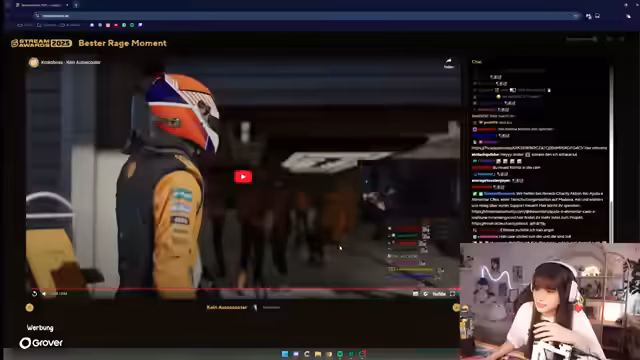 01:00:25Die Streamerin berichtet kurz über den Sieg des E-Sport-Teams T1 bei einem Wettkampf und erwähnt unterhaltsame Kommentare der Spieler. Sie wechselt dann zum Thema der Stream Awards, bei denen sie und andere nominiert sind. Sie fordert ihre Zuschauer auf, abzustimmen und biete an, einen Befehl im Chat einzurichten, um die Abstimmung zu erleichtern. Sie zeigt ihre Begeisterung für die Veranstaltung und hofft auf einen Sieg.