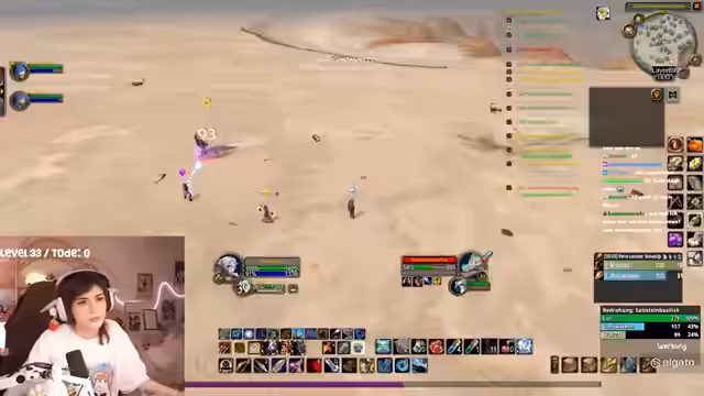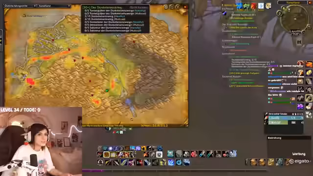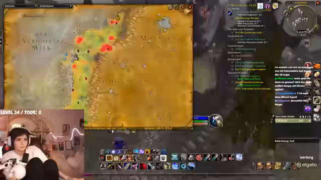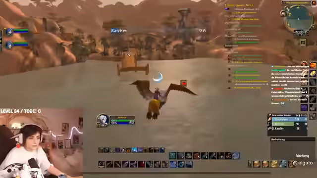 00:15:20Die Streamerin sucht Rat bezüglich der nächsten Schritte für ihren Level-33-Jäger. Es werden verschiedene Gebiete für Quests vorgeschlagen, darunter die Schimmernde Ebene auf Kalimdor und Schlingdorntal. Detaillierte Anweisungen für den Weg und die Gefahren, insbesondere durch Horde-Wachen und Aufzüge, werden gegeben. Ein enges Erlebnis, bei dem sie fälschlicherweise PvP-flaggt und nur knapp dem Tod entgeht, wird geschildert.