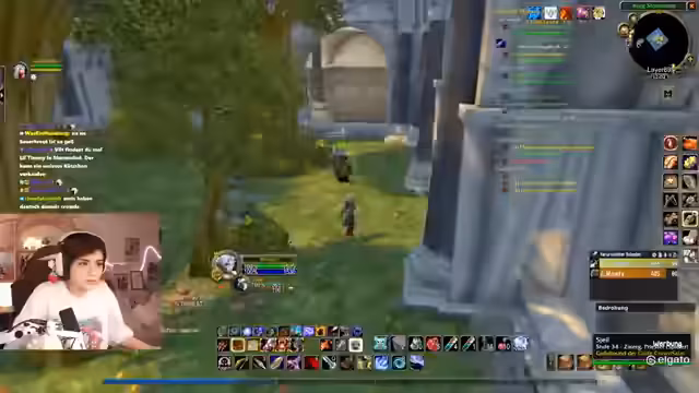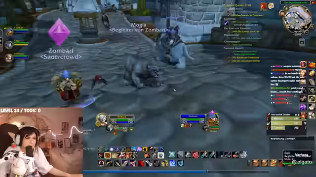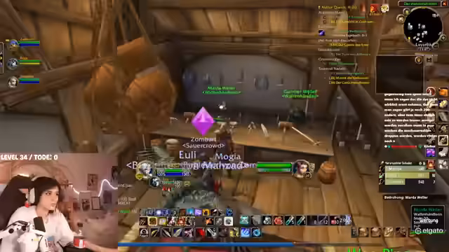 00:24:21Die Lösung einer interaktiven Quest, bei der ein Spionagebot in eine Frau verwandelt wird und dann zwei NPCs bekämpft werden müssen, wird gemeinsam mit Lena erarbeitet. Es werden Tipps zur Nutzung von Fallen und der Steuerung von Aggro gegeben. Ein weiteres Erlebnis in der Altstadt von Sturmwind wird geschildert, bei dem die Streamerin durch das Spawnen von Gegnern einen Herzinfarkt bekommt und die Wichtigkeit von Quest-Warnungen betont.