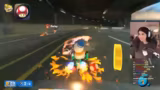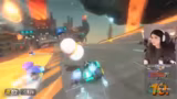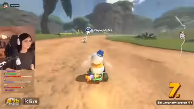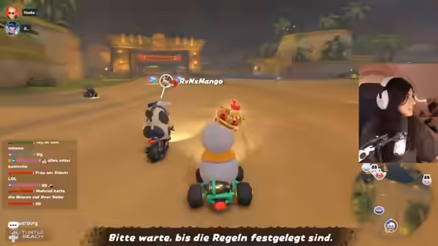 00:32:22Nachdem sich alle gefunden haben, beginnt das erste Rennen im klassischen Mario Kart-Stil. Die Spieler fahren gegen computergesteuerte Gegner auf einer überarbeiteten Strecke. Der Streamer ist von der Grafik und der Darstellung begeistert, findet aber die Steuerung zunächst gewöhnungsbedürftig, insbesondere den Drift-Modus. Während des Rennens werden häufige Positionwechsel und verschiedene Item-Uses kommentiert. Die Runde endet für den Streamer eher unbefriedigend auf einem hinteren Platz, woraufhin die Einstellungen und das Gameplay für die nächste Runde kritisch hinterfragt werden.