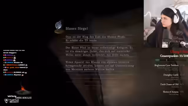 03:29:32Nachdem die Streamerin die Hafenstadt erkundet und Gavlan, den Händler, besucht hat, reist sie in das neue Gebiet 'Jägerhain', das sie kaum noch aus früheren Spielversuchen kennt. Sie äußert Verwirrung über die Route und muss ihre Notizen konsultieren. Ein Invader erscheint und blockiert den Zugang zum nächsten Bonfire, was die Streamerin zur Entscheidung zwingt, den Angreifer zu bekämpfen oder den Bereich zu meiden. Sie bemerkt, dass dieser spezifische Invader keine Punkte für ihre Challenge gibt, was die Situation frustrierend macht. Trotzdem konzentriert sie sich darauf, durch das Gebiet vorankommen und alle benötigten Gegenstände wie den 'Köderschädel' zu finden.
