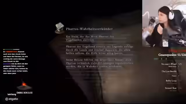 01:58:38Nach dem Sieg über Upsala geht es zurück nach Majula, dem zentralen Hub des Spiels. Die Streamerin ist besorgt über den Punkt, an dem sie im Spiel nicht mehr sterben darf, um nicht zurückgesetzt zu werden. Sie orientiert sich an Notizen und einem VOD, um ihren weiteren Weg zu planen. Dabei stellt sie fest, dass sie vergessen hat, in Majula einen Händler zu besuchen, um wichtige Ressourcen zu erwerben. In einem persönlichen Exkurs erwähnt sie, dass sie unter extremem Prüfungsstress und Lampenfieber leidet, was sie in der Vergangenheit schon beim Führerscheinerwerb dreimal scheiden ließ. Die Streamerin berichtet auch von ihrer finanziellen Situation und wie der Stream ihr ermöglicht hat, den Führerschein zu finanzieren.