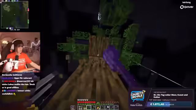 02:47:10Der Streamer begrüßt die Zuschauer zu einem entspannten Minecraft-Stream im Rahmen von Craft Attack, der gleichzeitig Spenden für einen guten Zweck sammelt. Aktuell wird Holz für ein riesiges Baumhaus auf einer Feen-Insel gefarmt. Es wird erwähnt, dass Eichenbäume (Oakbäume) nicht sehr viel Holz liefern, was den Farmprozess in die Länge zieht. Es wird auch über die Effizienz verschiedener Baumarten diskutiert, wobei Spruce als bessere Alternative genannt wird, obwohl bereits genügend Spruce-Holz vorhanden ist. Die anfängliche Schwierigkeit, genügend Holz zu sammeln, wird humorvoll kommentiert, da das Ziel von 10 Stacks noch nicht erreicht ist und der Prozess länger dauert als erwartet.