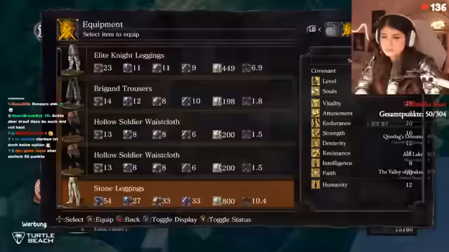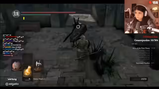 03:50:40Nach dem Capra Demon macht sich der Streamer auf den Weg in die Tiefen. Die Stimmung ist weiterhin angespannt, sein Puls bleibt konstant hoch, was er selbst als ungesund und nervös beschreibt. Trotz der körperlichen Anstrengung wird eine Humoresk-Haltung beibehalten. Ein Ziel ist es, eine Rüstung zu beschaffen, um die Fat-Roll-Bewegung zu ändern. Die Jagd auf den „Butcher“ und andere Gegner in den Tiefen verläuft holprig, aber stetig. Der Fokus liegt auf dem Sammeln von Items und der Vorbereitung auf die nächsten Herausforderungen, während die eigene Gesundheit im Auge behalten wird.