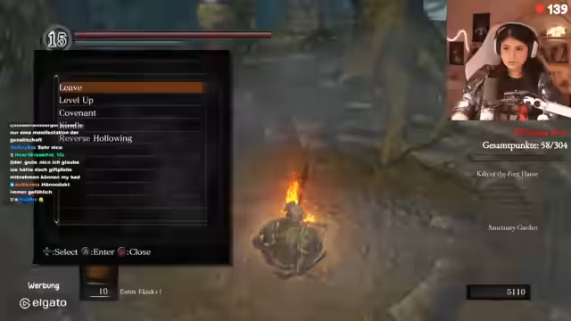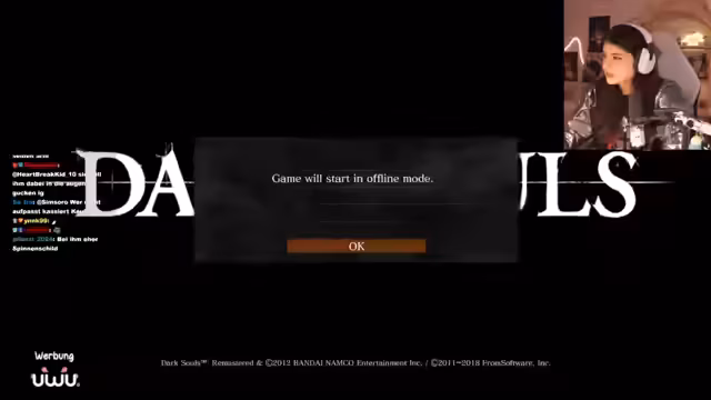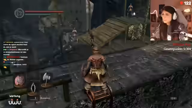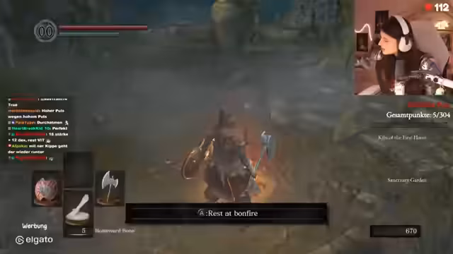 04:14:57Der Stream beginnt mit dem offiziellen 'Soulkeepers Run', einem Charity-Event für Dark Souls. Zunächst konzentriert sich die Streamerin auf das Erreichen des ersten Bosses, dem Asylum Demon. Die Navigation ist zunächst etwas unsicher, der Puls ist hoch, was auf Anspannung hindeutet. Nach einer kurzen Pause zur Beruhigung wird der Bosskampf fortgesetzt und dank der Anleitung des Chats erfolgreich gemeistert, was die ersten Punkte bringt.