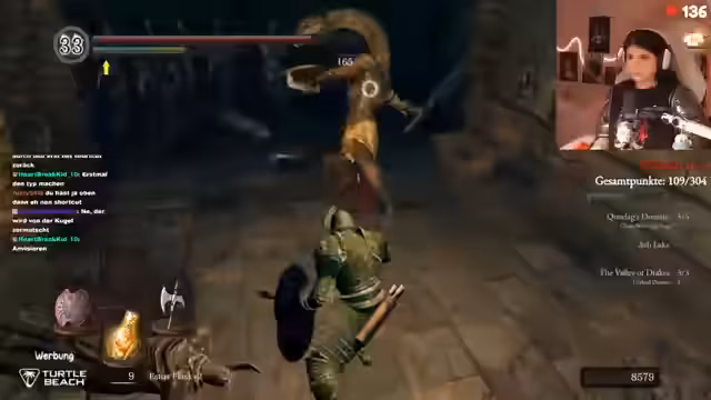 01:53:58Der Stream beginnt mit panischem Bedauern über einen vergessenen Gegner im Bereich „oben“. Nach der Initialpanne konzentriert sich der Streamer auf die unmittelbare Umgebung. Mit einem Spinnenschild bewaffnet, tritt er in die Schlacht gegen die Black Knights. Eine Begegnung mit dem Blitzmagier sorgt für immense Nervosität und einen hohen Puls, was den Fokus auf defensives Spiel und sicheres Vorgehen lenkt. Im Chat werden Unterstützer gewürdigt, ohne näher darauf einzugehen.