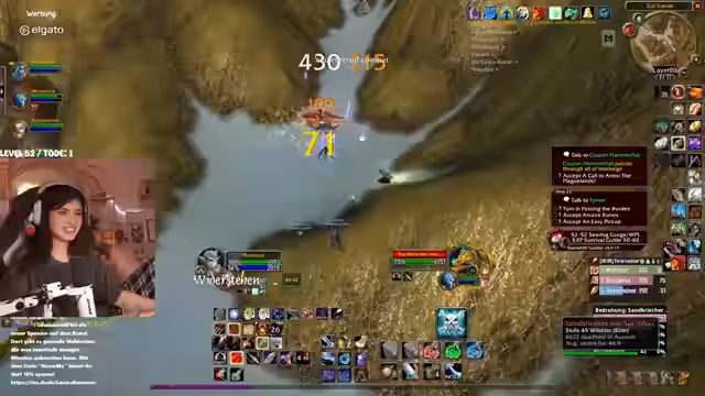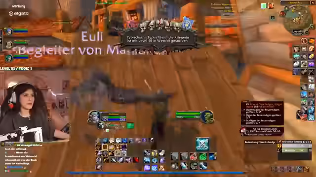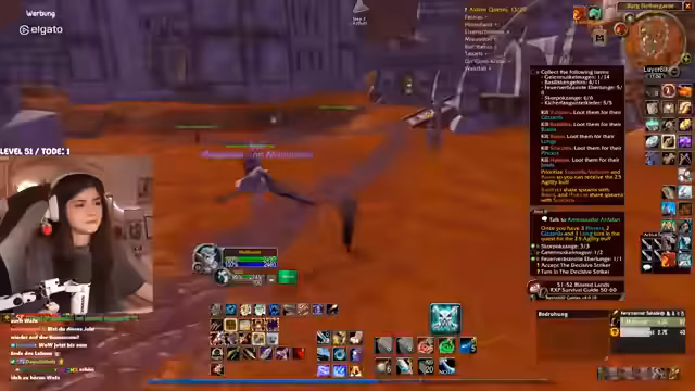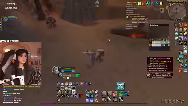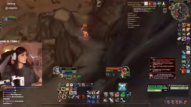 02:51:33Nach Abschluss der Aufgaben in Terramor beginnt die Reise in die 'Brennende Steppe'. Das Gebiet wird als unheimlich und bedrohlich beschrieben, mit lauter zerstörter Landschaft. Der Streamer bittet seine Mitspieler, nicht unnötig zu sterben, und trifft auf einen gefährlichen Elite-Drachen namens 'Vollchan'. Es wird strategisch vorgegangen, um das Spawnen von gefährlichen Gegnern wie Oger-Magiern und Elites zu vermeiden. Die Stimmung ist angespannt, da das Gebiet für den aktuellen Level als sehr schwierig gilt und jeder Fehler zu einem schnellen Tod führen kann.